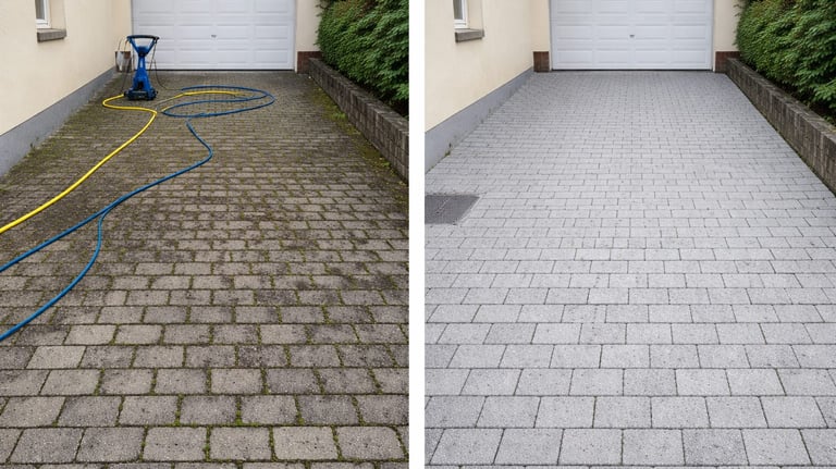 Grâce à un nettoyage haute pression adapté et à un traitement durable, nous redonnons une allée propre, sécurisée et visuellement nette, tout en respectant les matériaux.